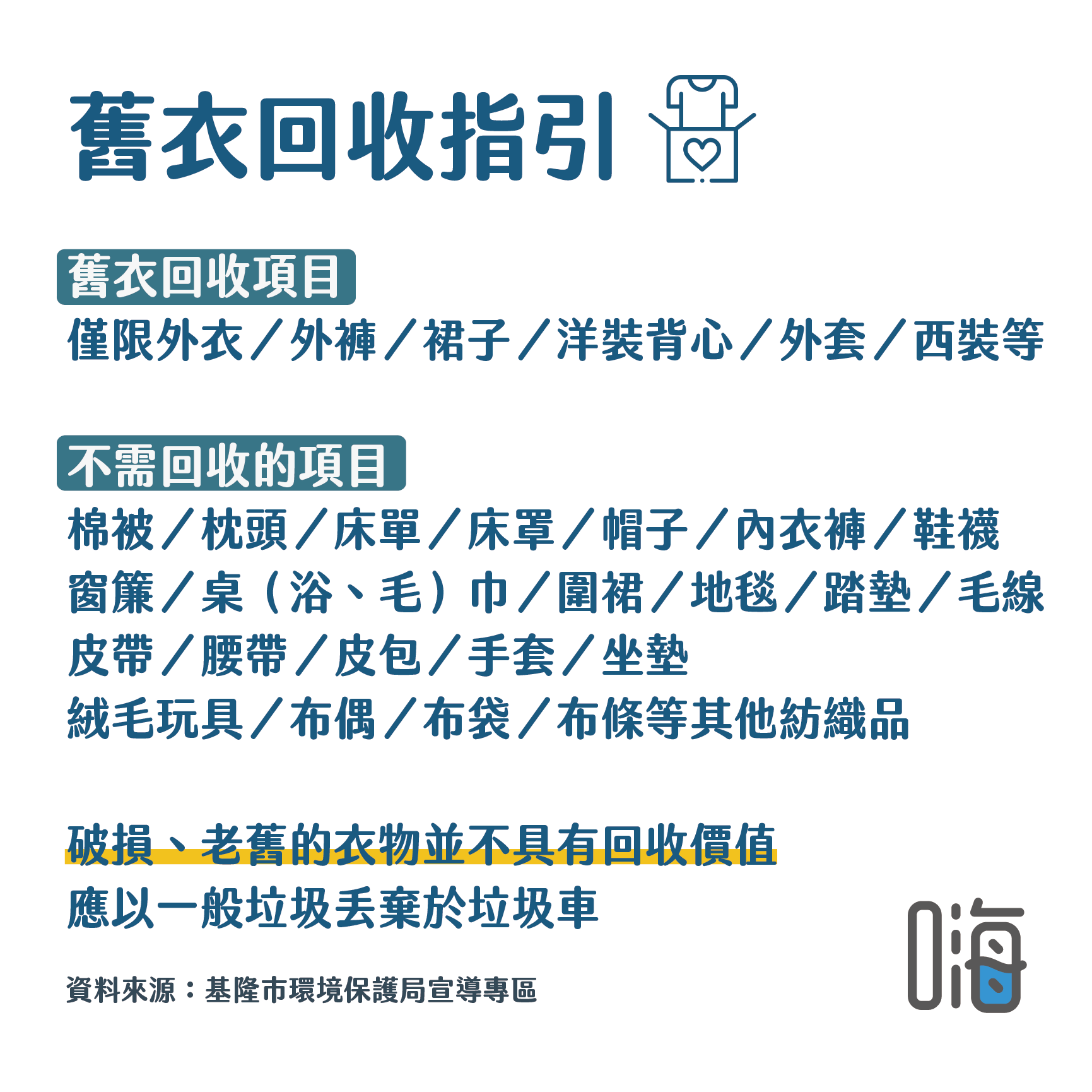 基隆舊衣回收箱位置在哪?衣服要怎麼回收?在斷捨離之後總是需要找舊衣回收箱吧?根據基隆市環境保護局的宣導,回收目的與精神就是要推廣舊衣回收共享概念,延長舊衣的使用壽命,是有益於環境和社會的做法,我們應該支持舊衣回收(至地方政府與福利機構合作合法舊衣回收箱設置地點),並努力將其推廣至更多人!
