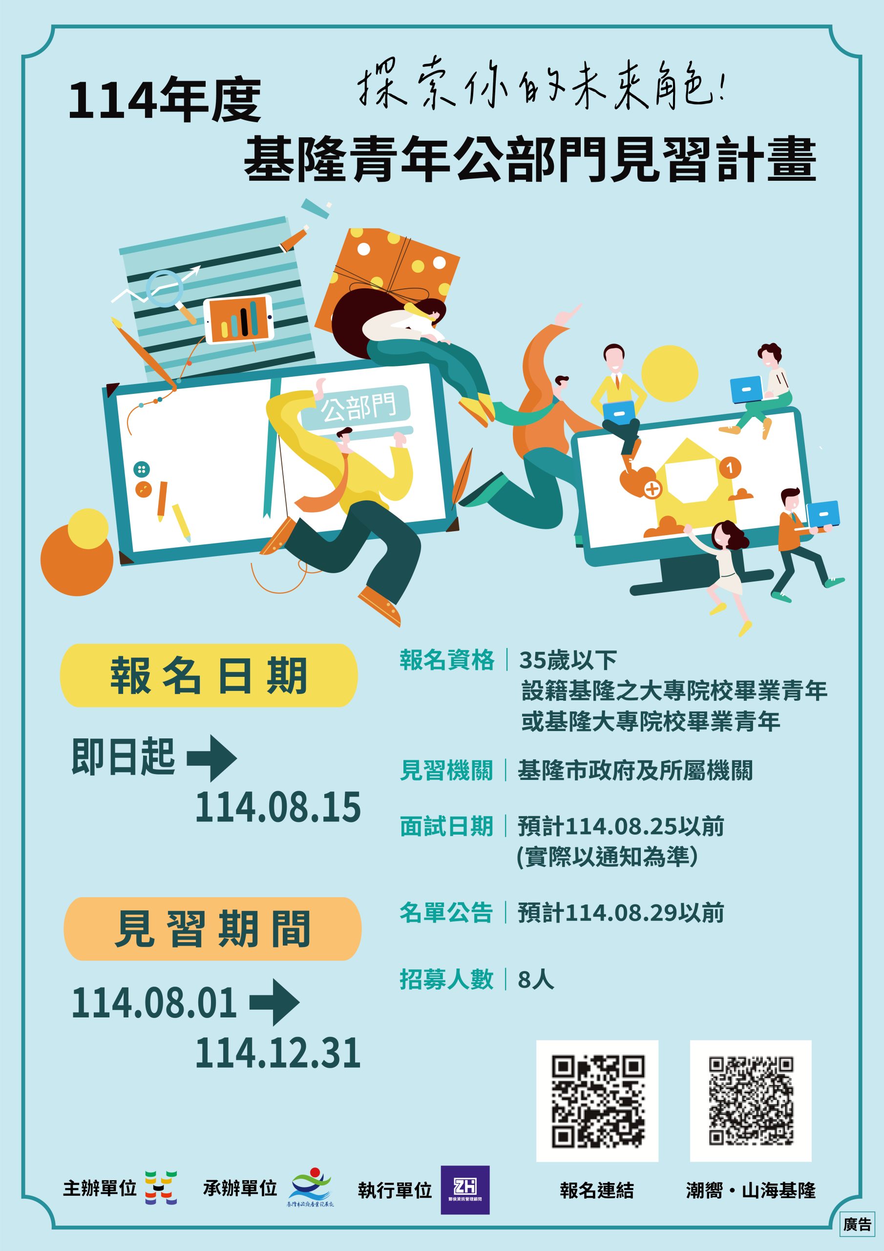 這是認識政府運作、培養職場能力的絕佳機會!報名方式與截止日期,請上基隆市政府產業發展處官網或臉書粉專「潮嚮.山海基隆」。對公部門有興趣的你,別再猶豫,快來報名,開啟職涯新篇章!