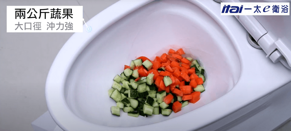 ▲經影片實測,可一次沖走兩斤蔬果(圖/截至itai一太e衛浴馬桶影片)