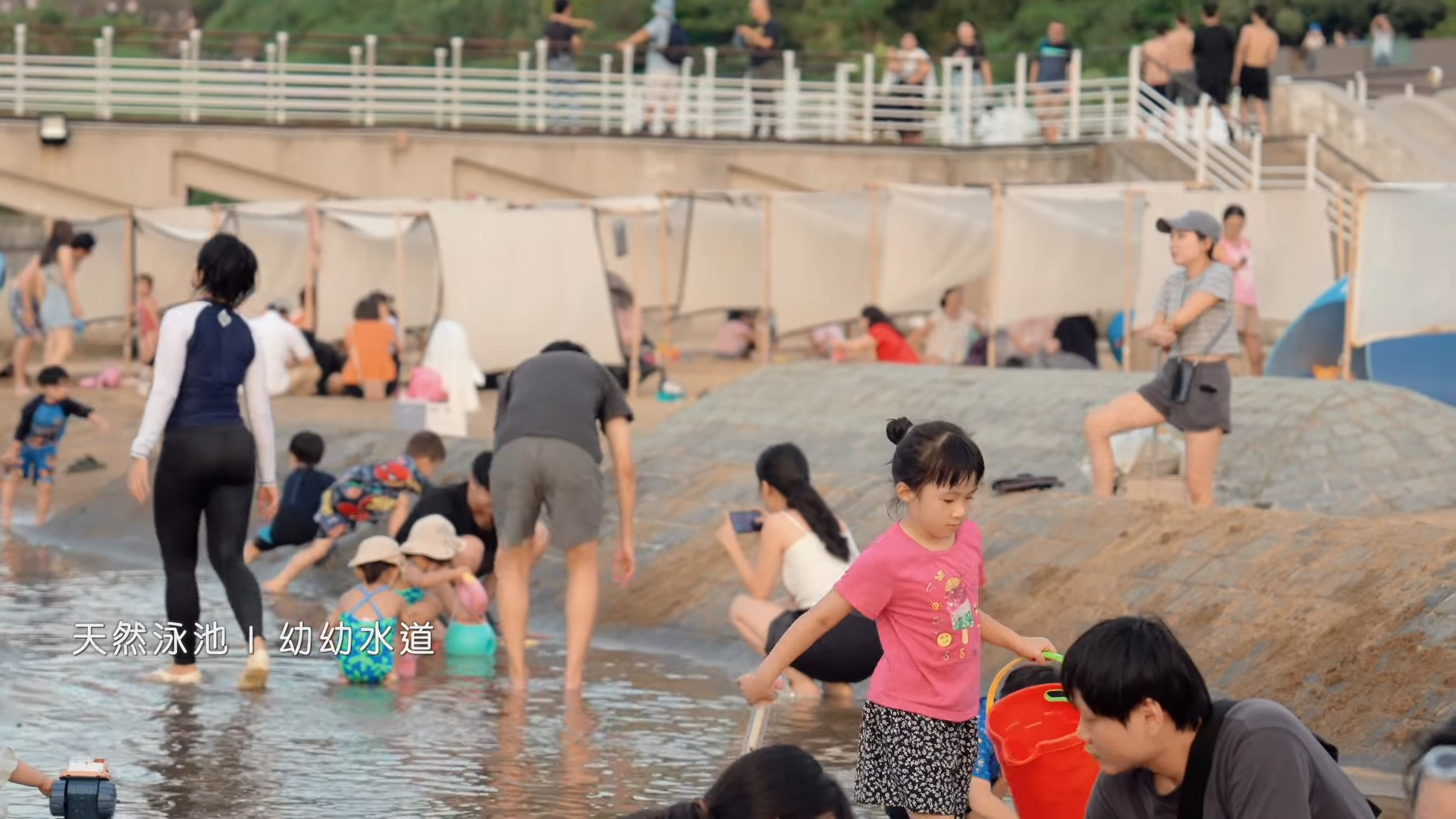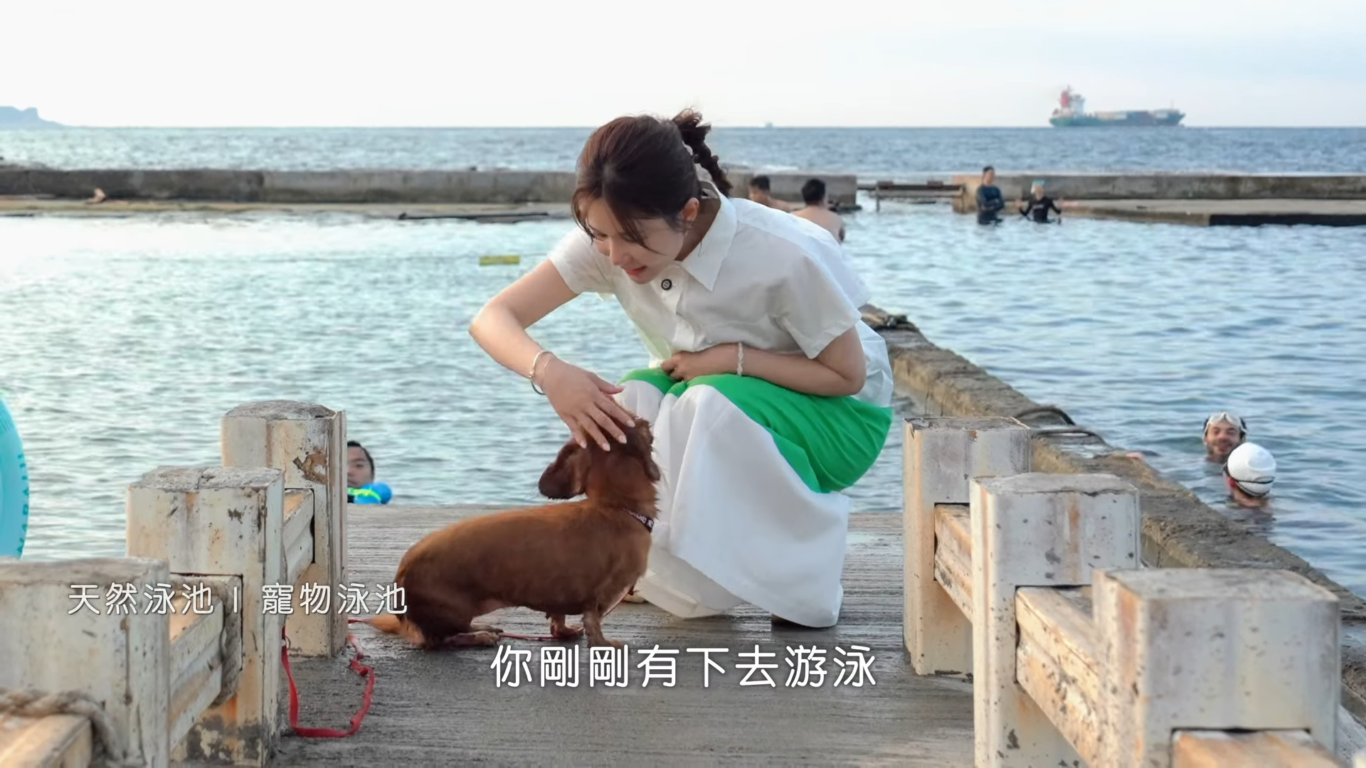 園區內的天然海水泳池與專屬的寵物泳池,提供遊客和毛小孩一個親水的空間。她與一隻剛游完泳的可愛狗狗互動,笑說:「你剛剛有下去游泳喔?怎麼這麼可愛。」營造出活動的溫馨與親民感。