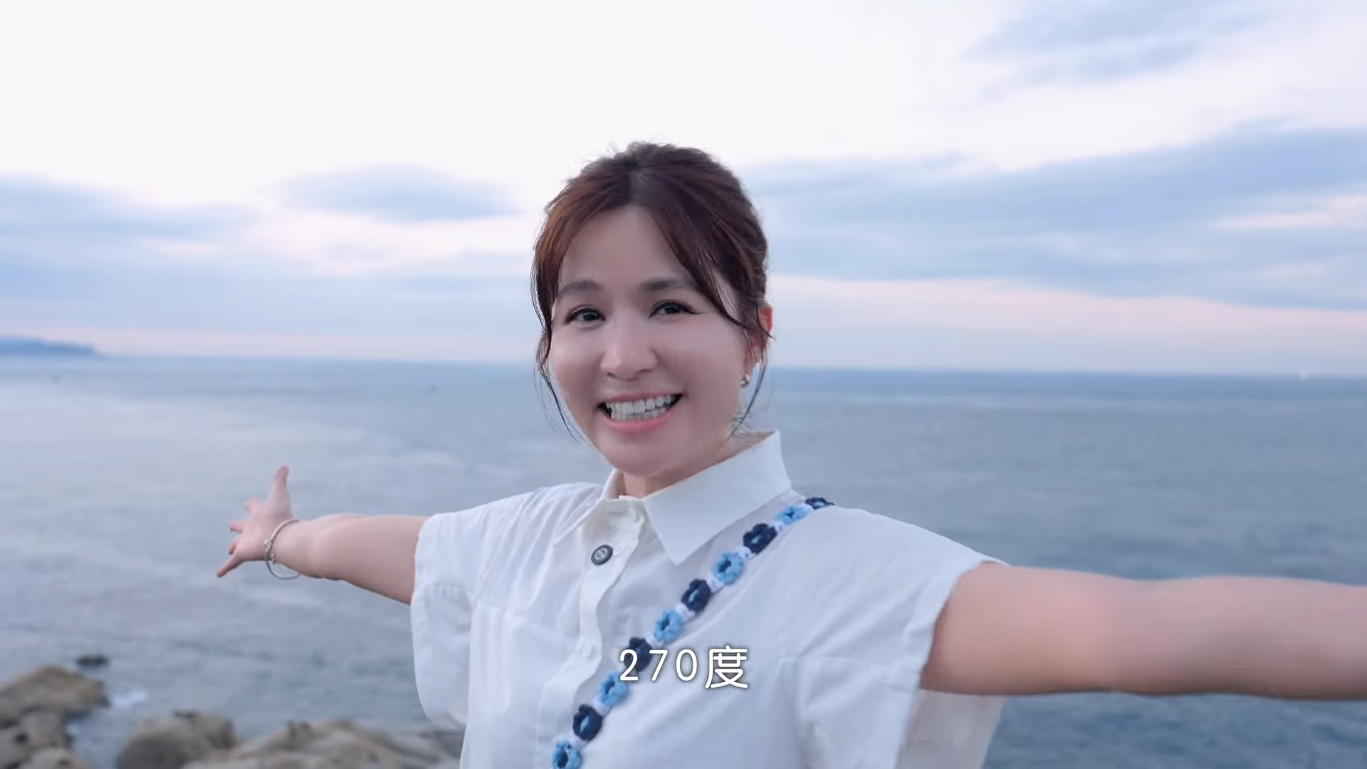 行程的尾聲,吳怡霈來到知名的「天使向海步道」。站在步道上,她張開雙臂,享受著海風,遠方絕美的日落光束灑落海面。她興奮地指著眼前270度的海景,大喊:「270度!太美了!」
