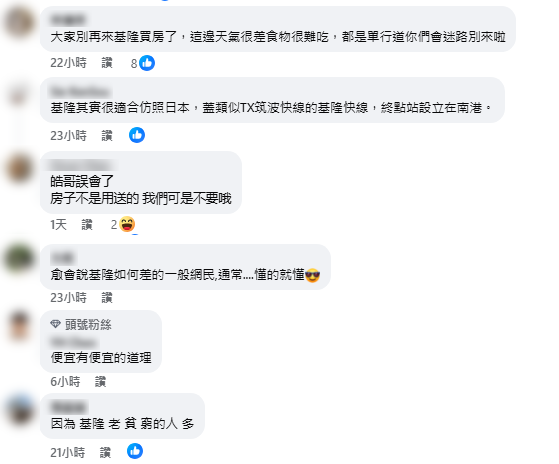 - 「房子不是用送的,我們可是不要哦!大家別再來基隆買房了,這邊天氣很差、食物很難吃,都是單行道你們會迷路別來啦!」