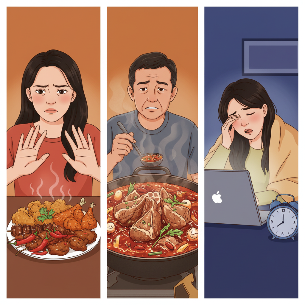 - 大補特補: 避免一下子吃太過溫熱滋補(如麻辣鍋、純羊肉爐)的食物,以免補過頭造成上火,應以平補為原則。
