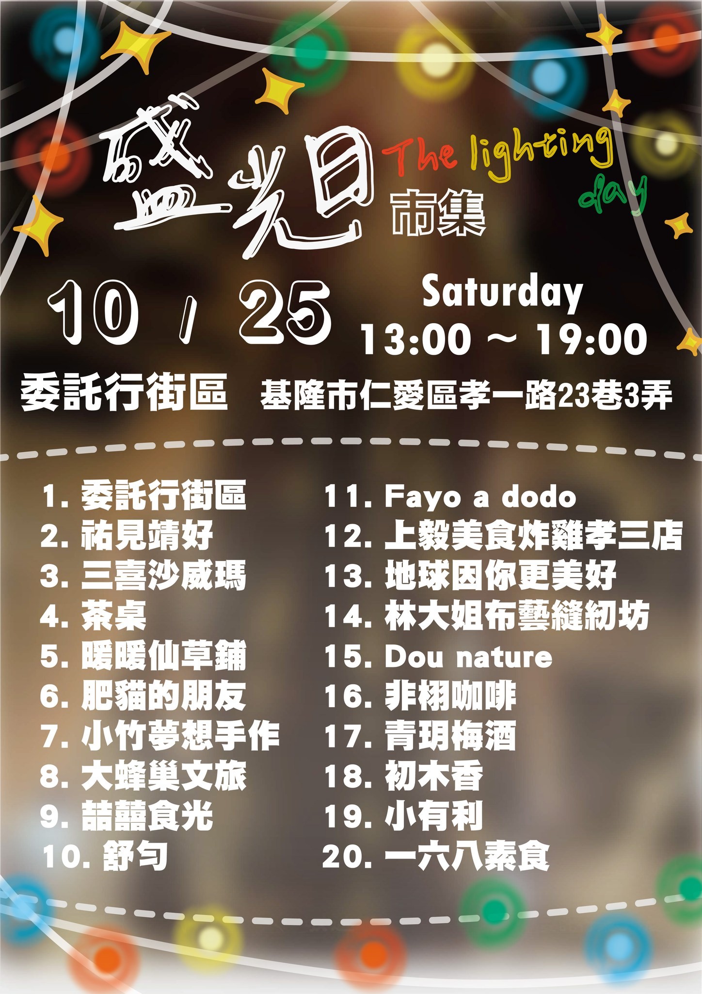 在10月25日不妨放慢腳步,在秋日的午後光影中,細細感受委託行街區的每一個角落。可以與攤友交流創作理念,品嚐在地特有的小食,或僅僅是找一個角落,感受那片即將被點亮的溫暖與活力。共同見證這條充滿歷史故事的巷弄,如何再次閃耀出屬於自己的光芒。