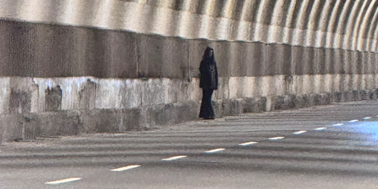 沒想到,買完東西返程,再次經過同一個地點,那個「身影」竟然轉過身,正面對著車道而立!雖然心裡發毛,但他趕著回家,立刻拿出手機快拍一張,想事後確認這究竟是「人」是「鬼」。