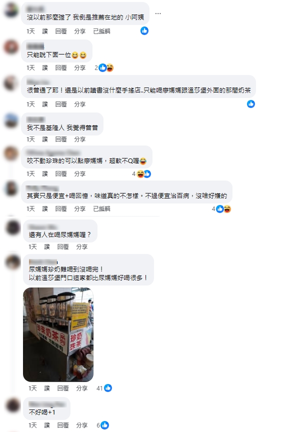 不少老基隆人也提到「溫莎堡前面那攤」的好滋味:「早期溫莎堡前面有一攤在賣的珍珠奶茶才是我心目中的冠軍」、「以前溫莎堡門口這家都比尿媽媽好喝很多!」、「以前讀書沒什麼手搖店..只能喝廖媽媽跟溫莎堡外面的那間奶茶」。