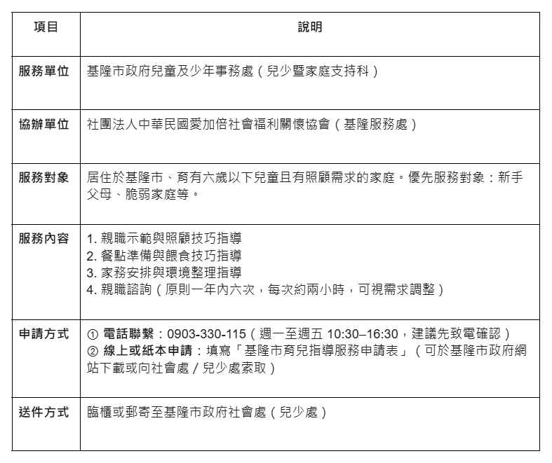 這項服務開放給所有居住於基隆市、育有六歲以下兒童且有照顧需求的家庭申請。經協會媒合後,專業指導員將免費到宅提供親職示範、餐點準備、家務指導與親職諮詢等四項服務,協助家長建立正向教養觀念,掌握關鍵照護技巧。