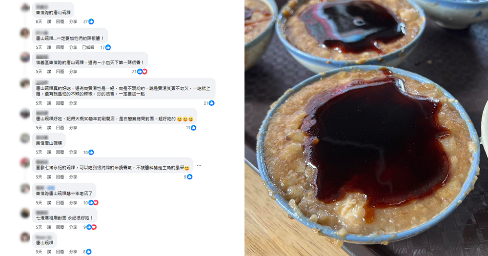 從留言區可見「唐山碗粿」獲得最多支持。「東信路唐山碗粿」、「信義區東信路的唐山碗粿」、「唐山碗粿真的好吃」等推薦不斷。有老饕更直言:「唐山超級好吃!」、「小時候都吃唐山碗粿」,顯示這家老店在基隆人心中地位非凡。