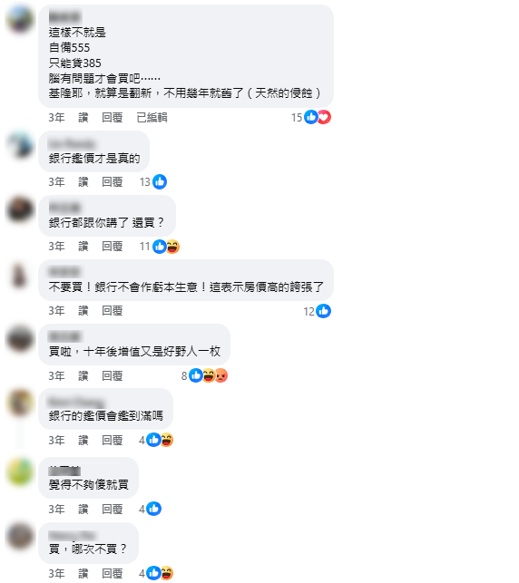 有網友算完帳後直言:「這樣不就是自備555萬、只能貸385萬,腦有問題才會買吧……基隆耶,就算是翻新,不用幾年就舊了(天然的侵蝕)。」