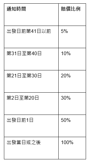 基隆律師 吳恆輝說明,根據行政院核定、交通部觀光署公告之《國外旅遊定型化契約應記載及不得記載事項》,若因旅行社單方面取消行程,應按通知旅客時間的早晚賠償旅遊費用的一定比例作為違約金。其標準如下: