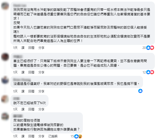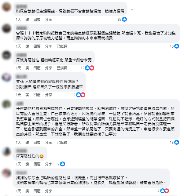 原PO在文中表示不解,認為只是狗狗尿尿,為何會導致需要換輪胎,甚至質疑4800元的賠償金額過高。然而,貼文曝光後,風向並未如原PO預期般倒向質疑車主,反而引來大量網友「科普」。
