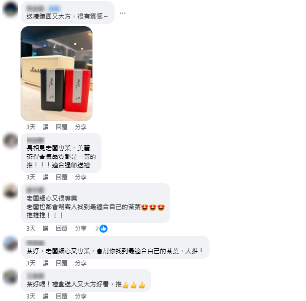 網友紛紛留言表示:「送禮體面又大方,很有質感」、「老闆細心又很專業,會幫你找到最適合自己的茶葉」、「入口回甘,我送禮都在這裡買」、「茶好喝,禮盒送人又大方好看」。