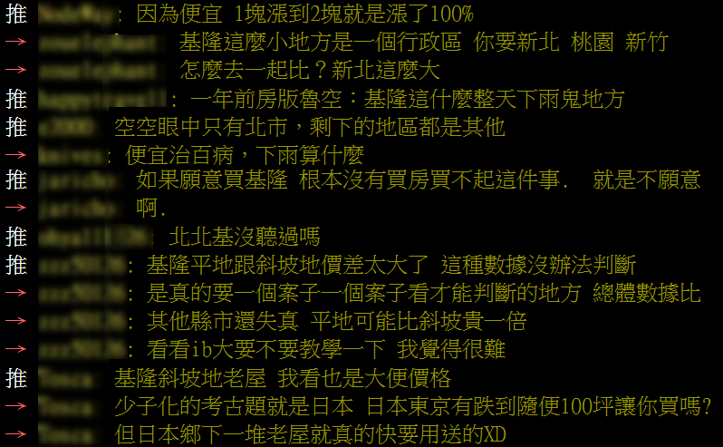 因此,PTT 網友強烈建議,想去基隆首購撿便宜的人,必須「一個案子一個案子看」,不要看到平均漲幅高就衝進去,以免買到難以脫手的山坡老宅。