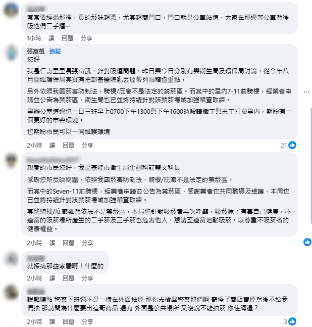 基隆市區騎樓與公共場所的吸菸問題,經常引發在地民眾熱議。近日有網友在臉書社團「基隆人日常」發文表示「原以為孝三路人行騎樓已是吸菸重災區,沒想到衛生福利部基隆醫院(署基)對面的超商與人行道,才是真正的『吸菸熱區』」。由於該處緊鄰基隆市衛生局與市警局,超諷刺的地理位置讓網友忍不住吐槽,話題不僅引發數百則留言討論,更釣出衛生局科長與環保局人員親上火線回應,轄區仁壽里里長也受訪吐露維護環境的艱辛。