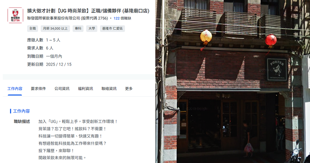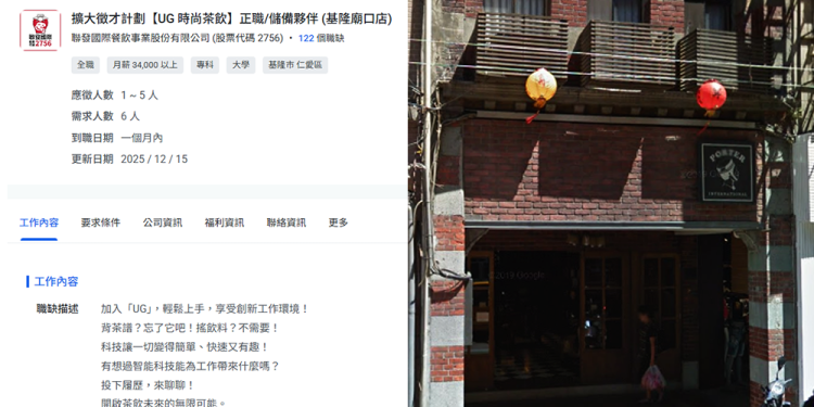基隆手搖飲市場再添生力軍!近期有民眾在人力銀行網站發現,隸屬於聯發國際餐飲集團旗下的手搖品牌「UG時尚茶飲」已悄悄開設基隆分店的職缺招募,地點選在人潮眾多的仁愛區愛三路。消息一出,隨即引發在地茶飲愛好者的關注。