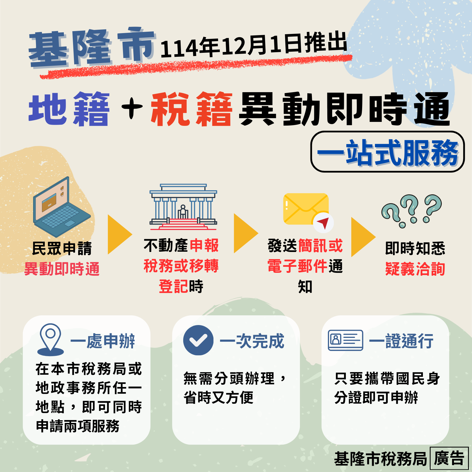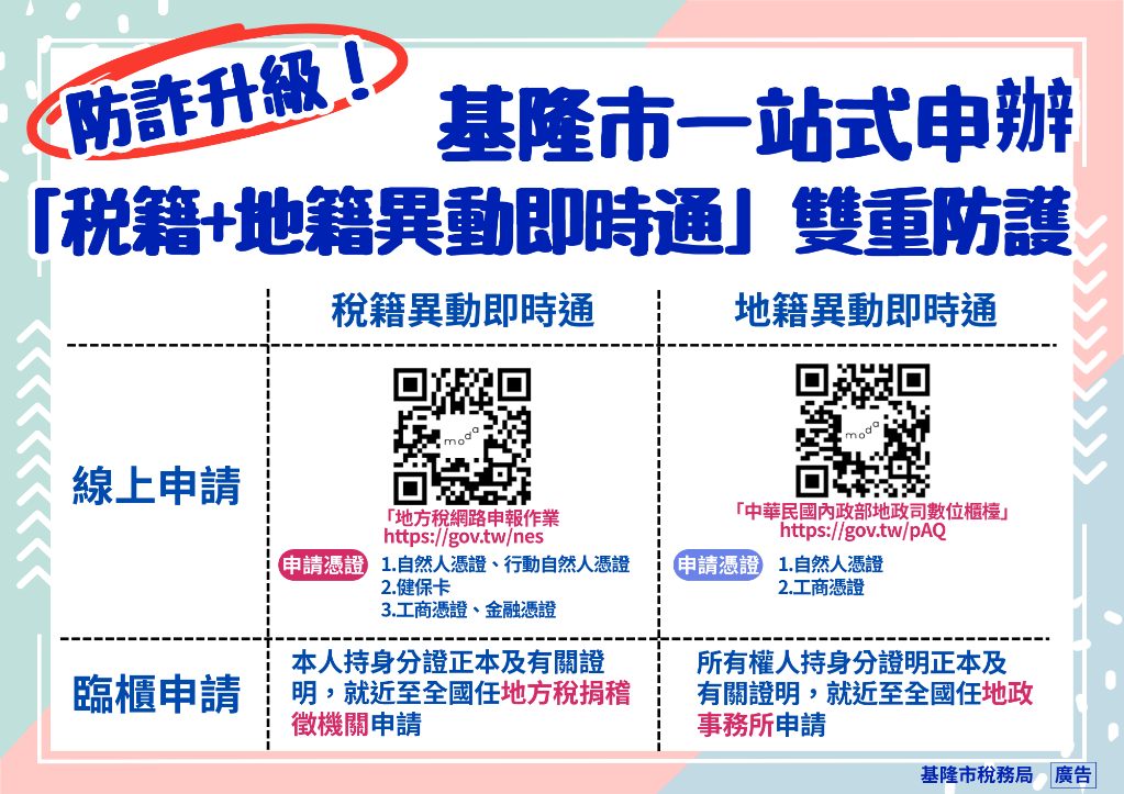 詐騙手法層出不窮,為了保護民眾的房產安全,行政服務也全面數位化升級。基隆市稅務局與地政事務所合作,已自114年12月起優化「稅籍+地籍異動即時通」服務。