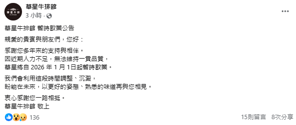 華星牛排館稍早透過官方臉書發出正式公告,坦言近期因人力嚴重不足,已難以維持長久以來堅持的服務與餐點品質。經過審慎考量,決定自 2026年1月1日 起暫時停止營業。