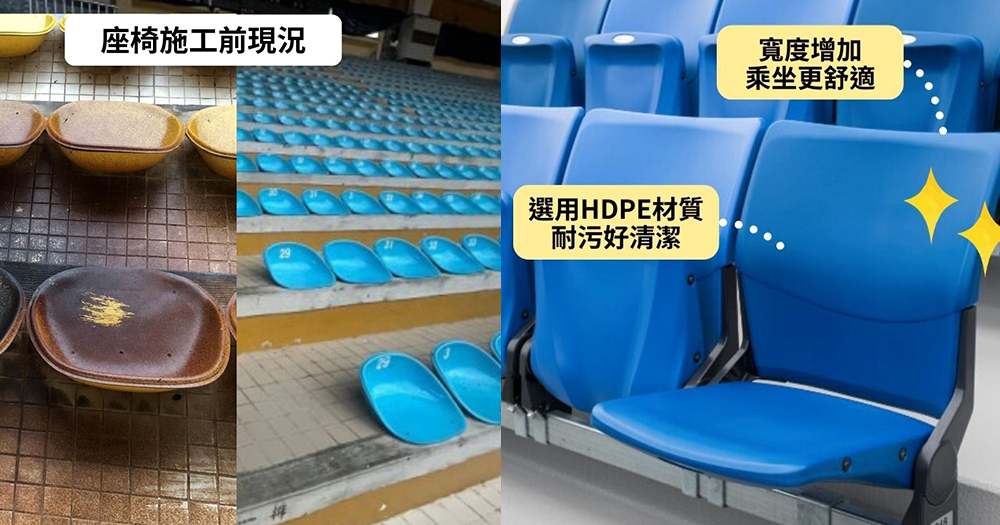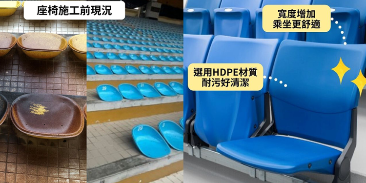新座椅採用高密度聚乙烯塑材,具備耐衝擊、耐髒汙特性。設計上符合人體工學,支撐性佳,且加大了座位間距並附設杯架,大幅提升觀賽舒適度。