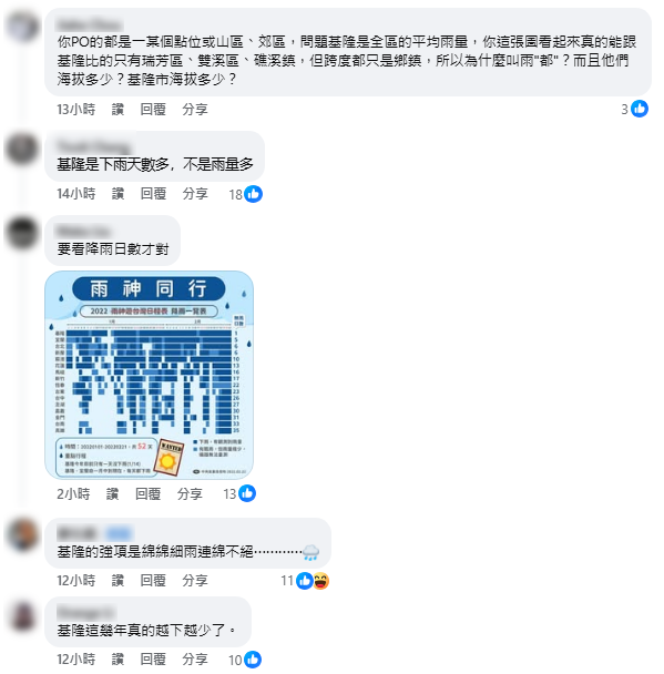 這份榜單轉發至臉書社團「基隆人日常」後,立刻引發在地網友熱烈討論。許多基隆人對於「沒進前10名」感到不可置信,但隨即有內行網友突破盲點,指出這份榜單比的是「累積總雨量」,而非「降雨天數」。