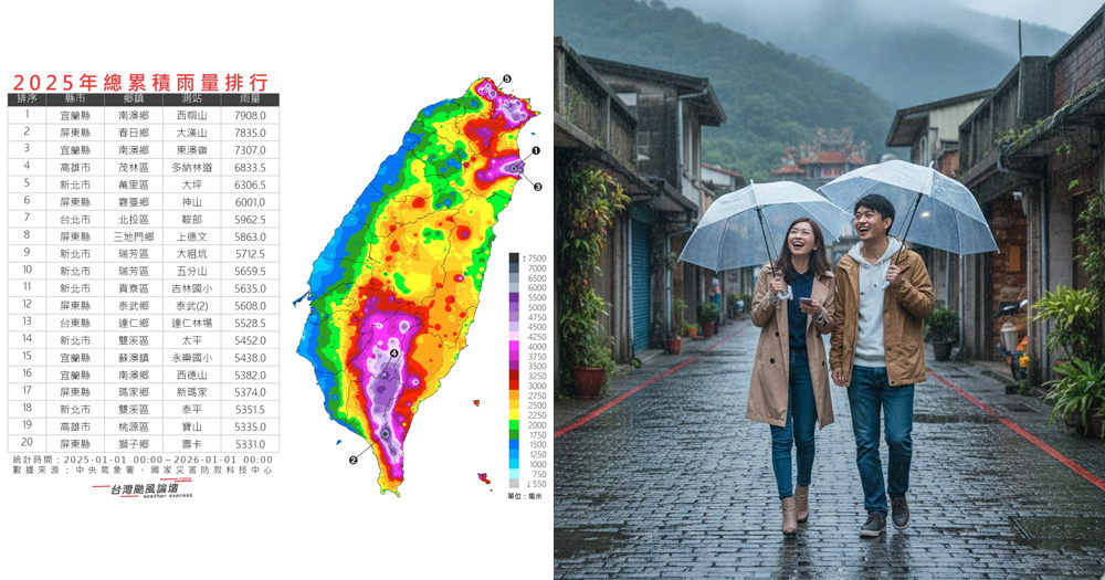 根據「台灣颱風論壇|天氣特急」引用中央氣象署及國家災害防救科技中心的數據顯示,2025年的年度「雨量王」由宜蘭縣南澳鄉的「西帽山」測站奪下,全年累積雨量高達7908毫米,數據相當驚人。粉專分析指出,宜蘭南澳堪稱「台灣雨極」,在前三名中就強勢包辦兩席(第一名西帽山、第三名東澳嶺),主要原因在於東北季風加上颱風共伴效應的加持,讓該地區雨勢極為猛烈。