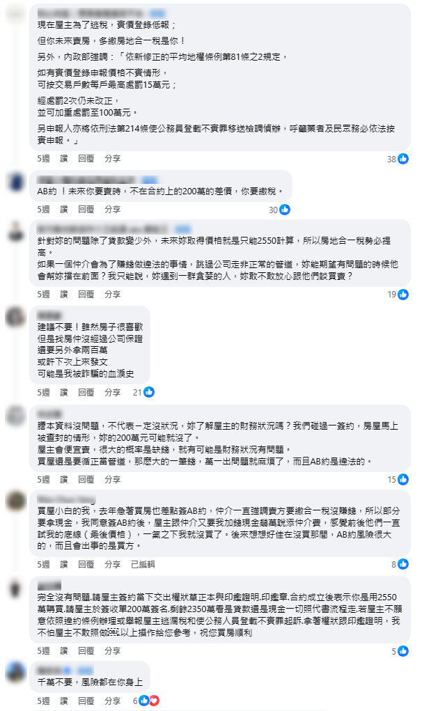 在本案例中,賣方試圖利用低報成交價來減少帳面獲利,進而規避短期持有需繳納的45%房地合一稅。然而,對於買方而言,雖然看似能以較低價格入手,但實際上卻必須配合演出,且需在沒有保障的情況下支付大筆現金。多數社團成員指出,這種要求完全是將賣方的稅務成本與法律風險轉嫁給買方。