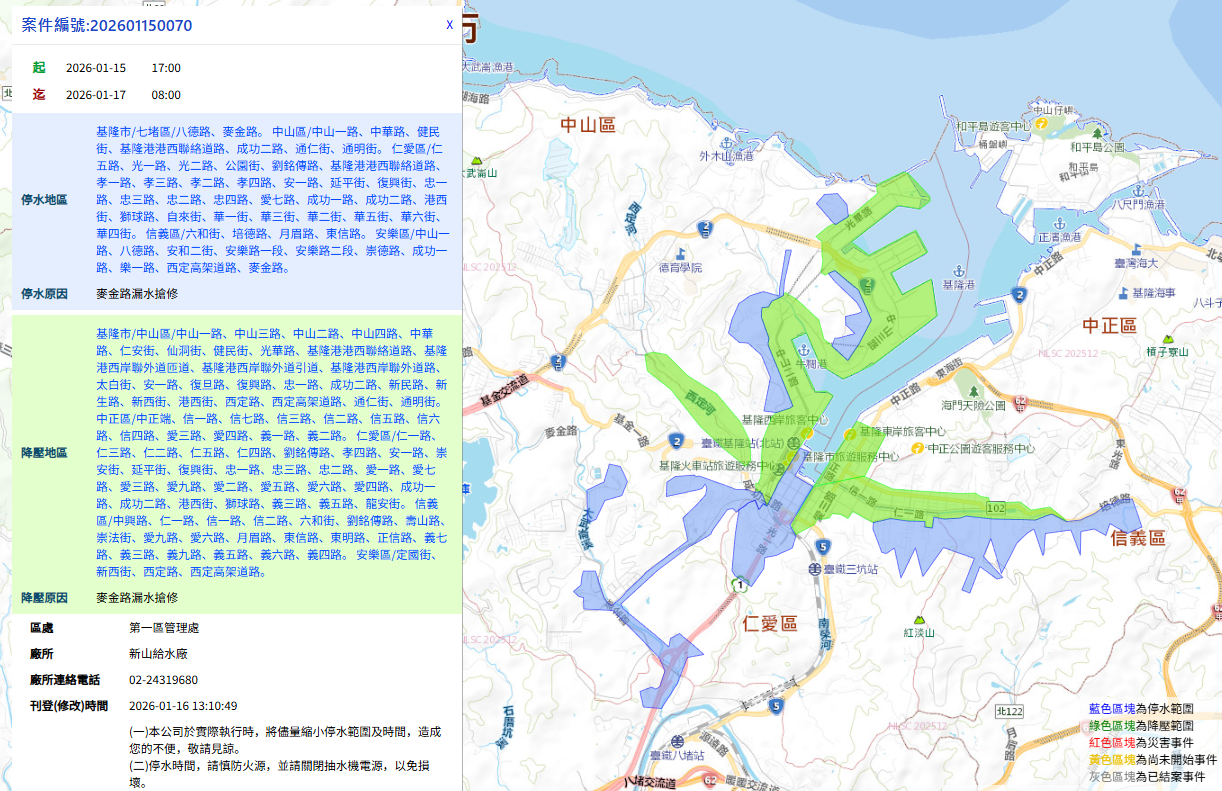 - 影響範圍: 七堵、中山、中正、仁愛、信義及安樂區部分區域。