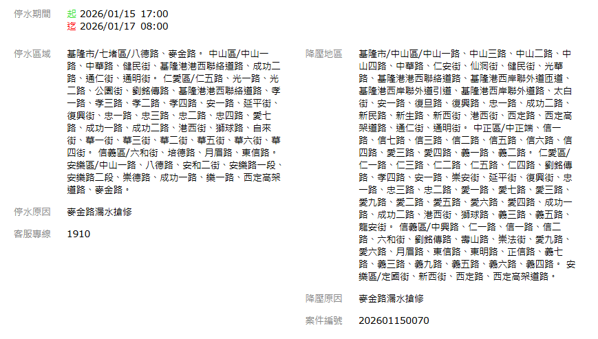 1/15基隆停水延長通知:麥金路漏水搶修