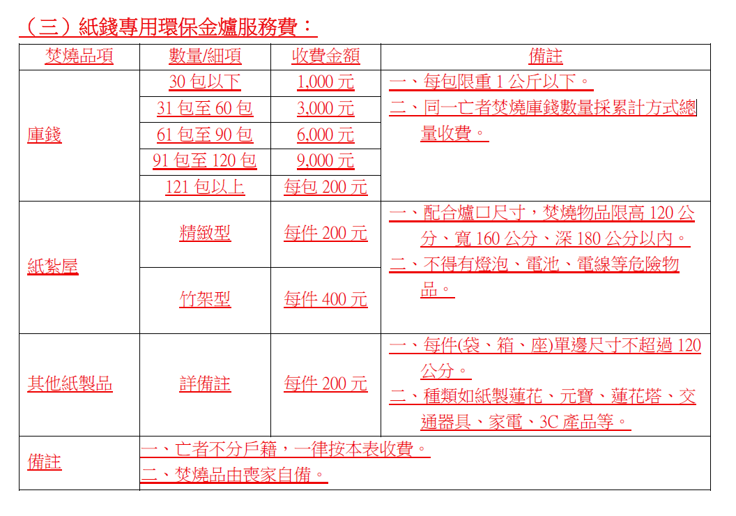 根據最新法規,焚燒其他紙製品(如紙蓮花、紙元寶等)將每件酌收200元的使用費。
