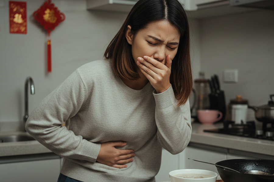 第三種常見問題是「急性腸胃炎」,春節期間菜餚豐盛,若隔夜菜反覆加熱,或海鮮食材處理不當,極容易滋生細菌,引發上吐下瀉的急性症狀。