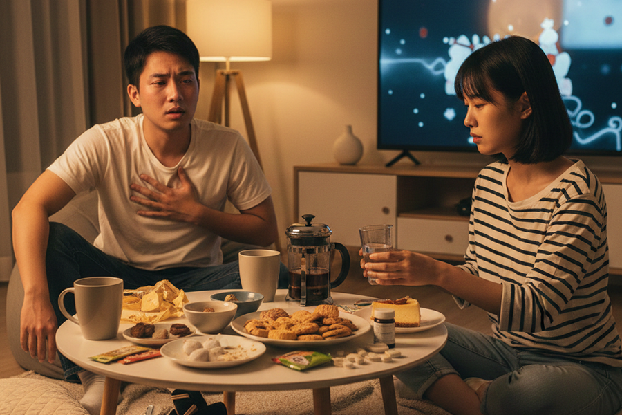 其次是「胃食道逆流」,熬夜守歲時,不少人會準備甜食、咖啡或茶飲,攝取過多容易出現火燒心的症狀。