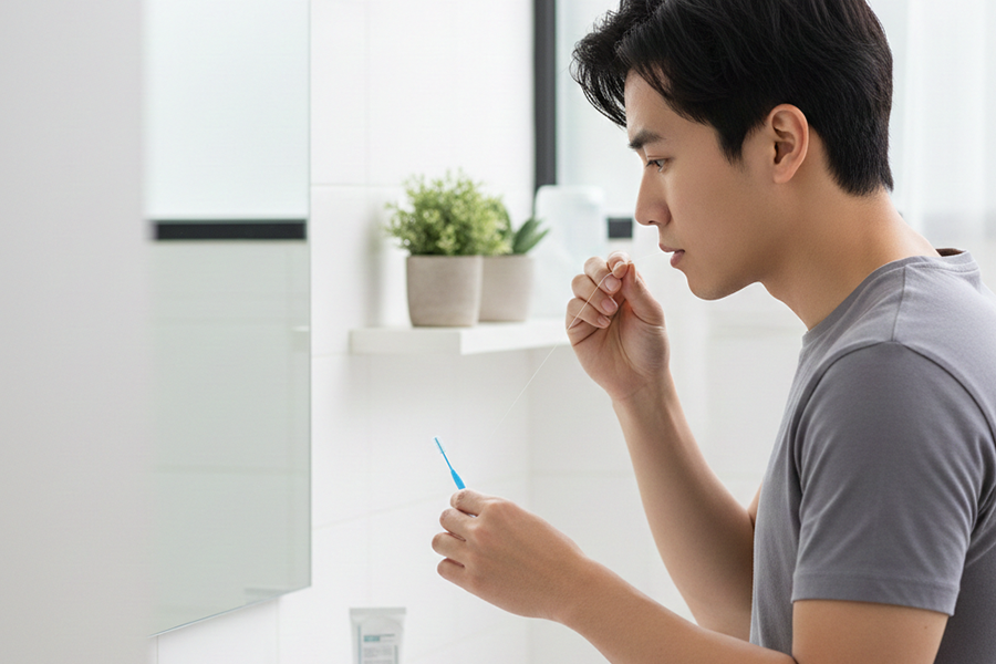 在刷牙前,先使用牙線或牙間刷。這一步至關重要,目的是將卡在牙縫中的肉屑與纖維徹底清除。切記,牙刷刷不到的地方,才是牙周病的溫床。