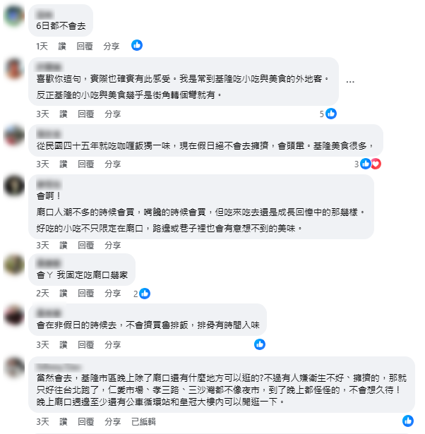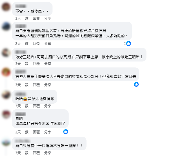 當然也有人對廟口持保留態度,「難停車」與「價格偏高」是兩大勸退主因,還有人直言衛生條件不理想。這群人選擇把廟口讓給觀光客,自己轉往仁愛市場二樓、孝三路或三沙灣覓食。