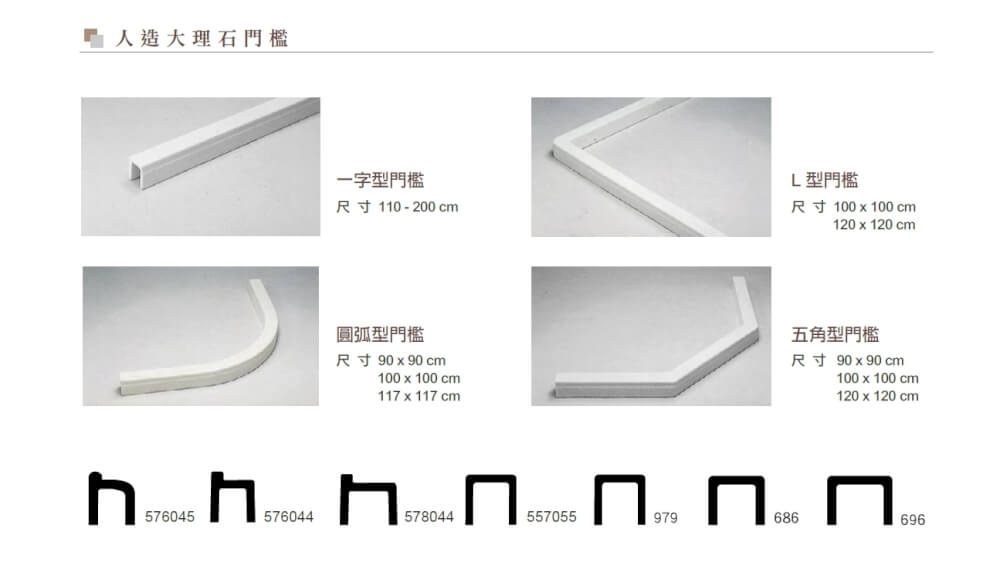 • 圓弧型:專門搭配圓弧型淋浴門,線條柔和優雅,能節省轉角佔用的動線。多搭配對應弧度的ㄇ型門檻,提供滑軌平整的支撐面。