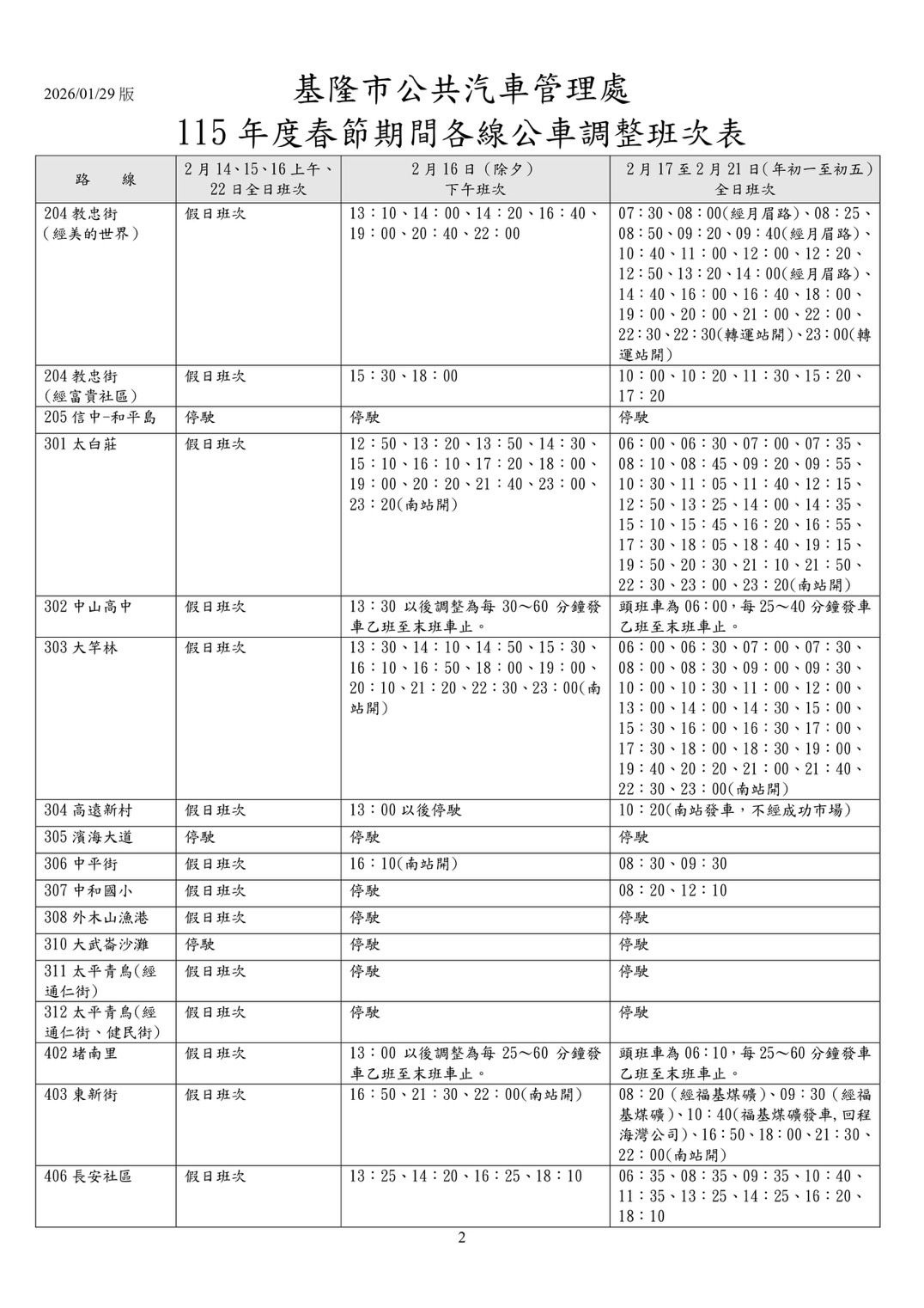 - 2月17日至21日(初一至初五):依據「春節班表」營運。