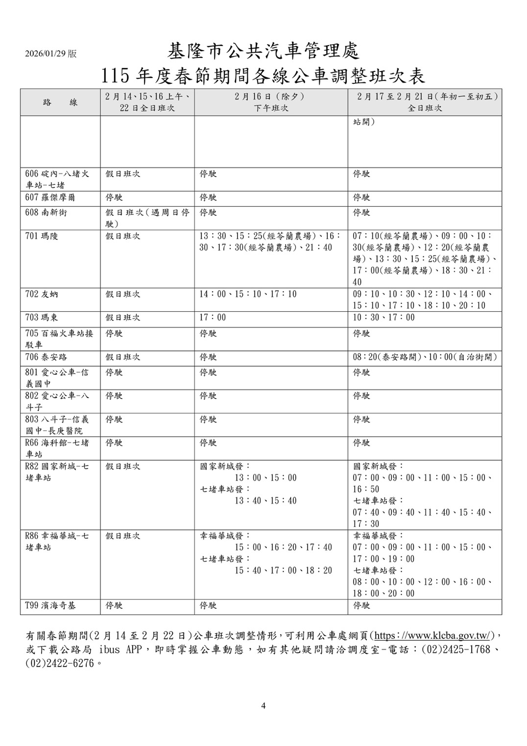 - 官網查詢:至基隆市公車處網頁「最新消息」專區確認各路線班表。