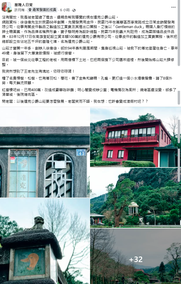 基隆七堵瑪陵坑的山林深處,藏著一座佔地五千坪的歐式莊園,它曾是台灣自創精品品牌「達克公爵」的總部,卻因創辦人在颱風夜意外離世而沉寂近20年。近日有網友在「基隆人日常」社團分享實地探訪經歷,揭開這座山莊的最新面貌,引發熱烈討論,不少基隆人驚呼:「原來七堵還有這種地方!」
