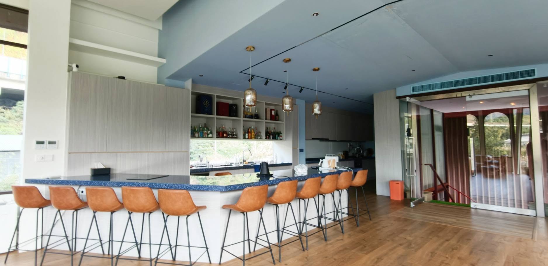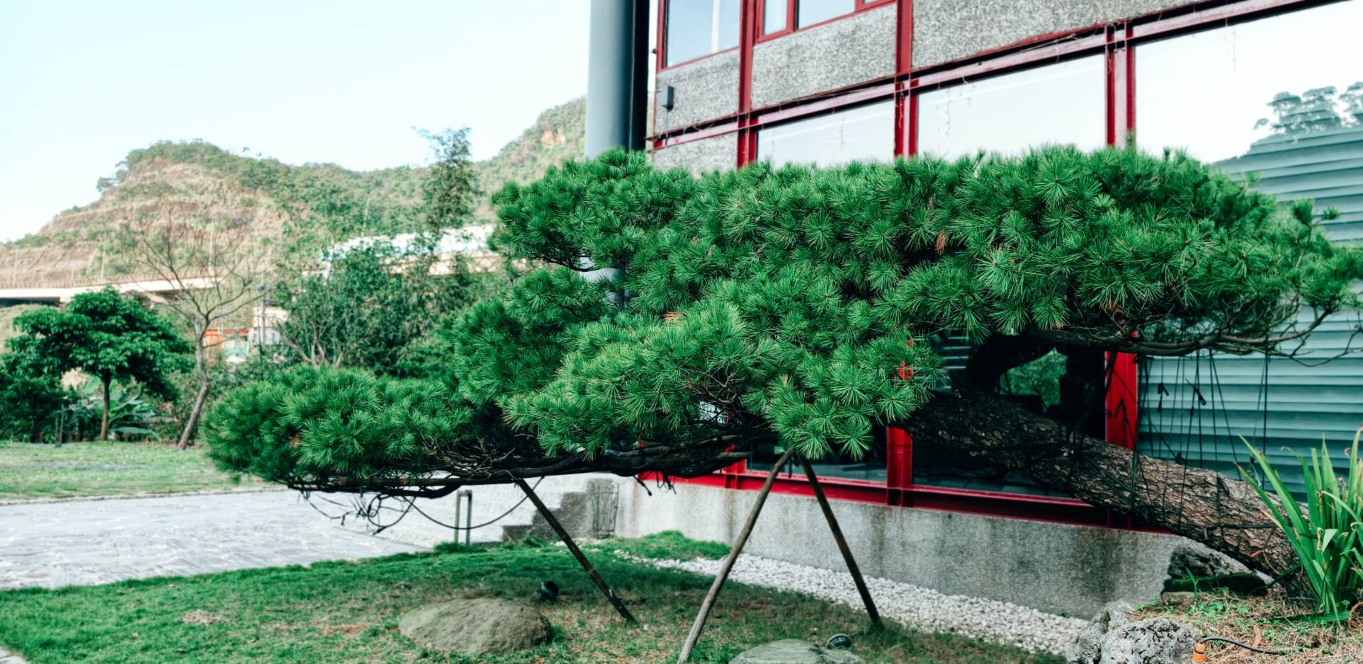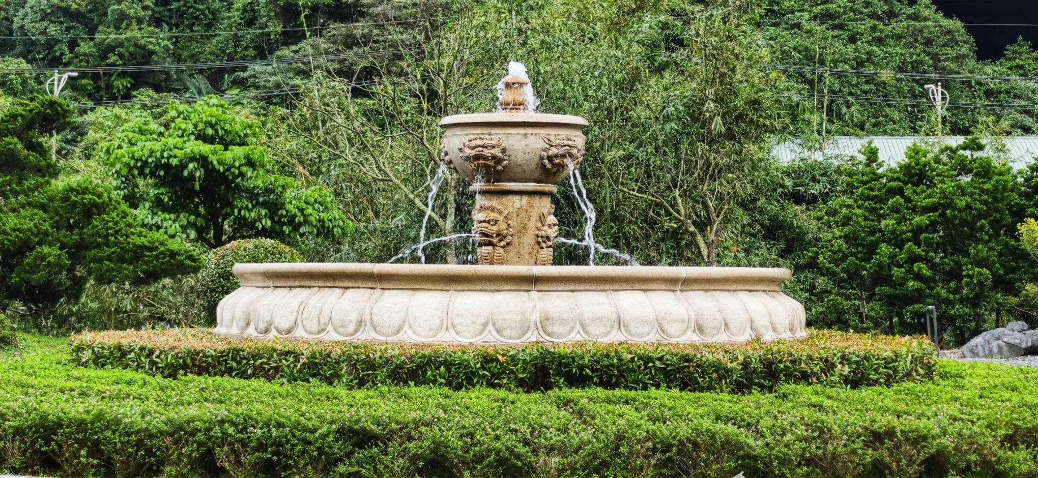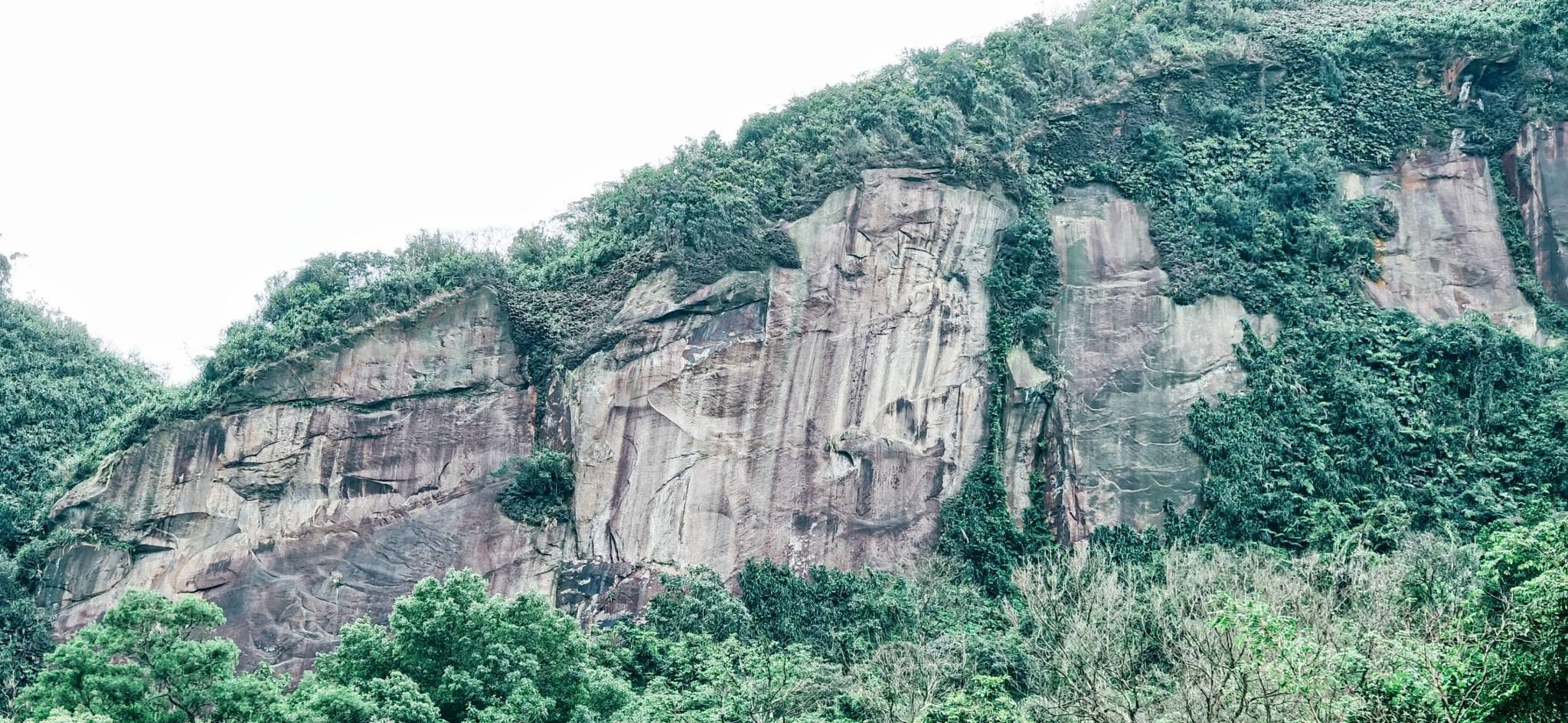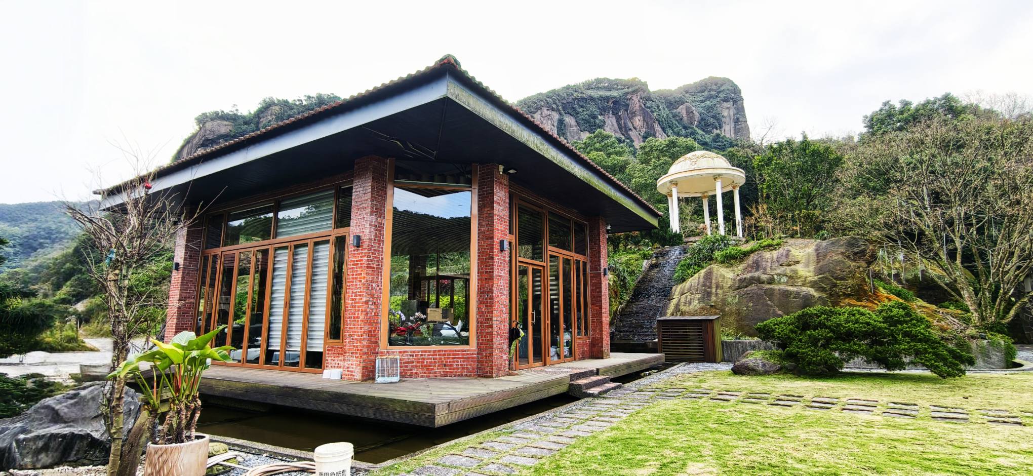 山莊最令人印象深刻的,是背後那面壯觀的裸露岩壁,巨大的石壁與園區內的精緻造景形成強烈對比,氣勢相當震撼。