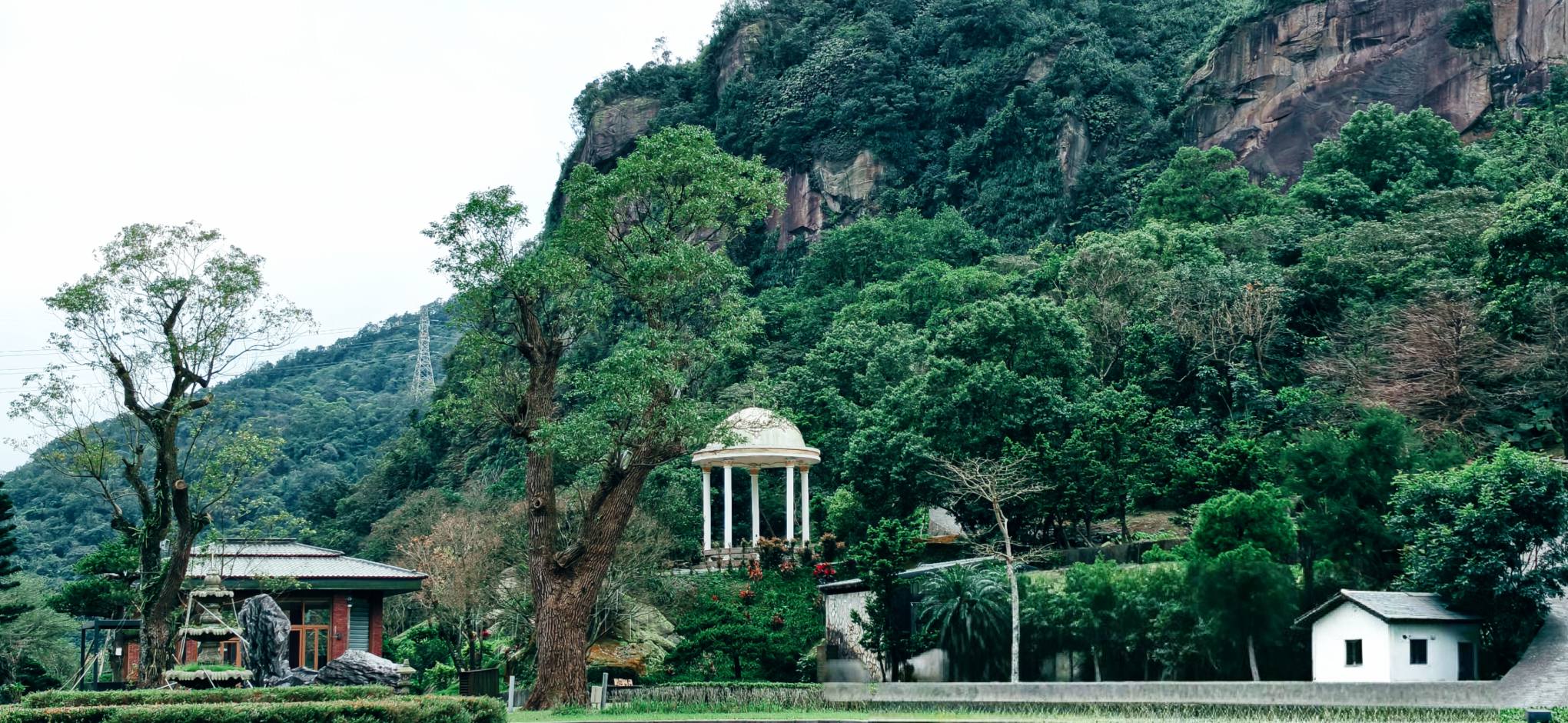 園內規劃了多棟建物,包括紅色外牆的「紅塵樓」與充滿東方氣息的「明心閣」。園區內更有歐式圓頂涼亭、人工瀑布與木棧道。