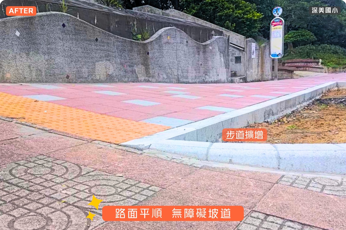 ▲深美國小步道寬敞、平整,無障礙設施也一應俱全,讓整體通學環境更加完善(圖/基隆市政府教育處)