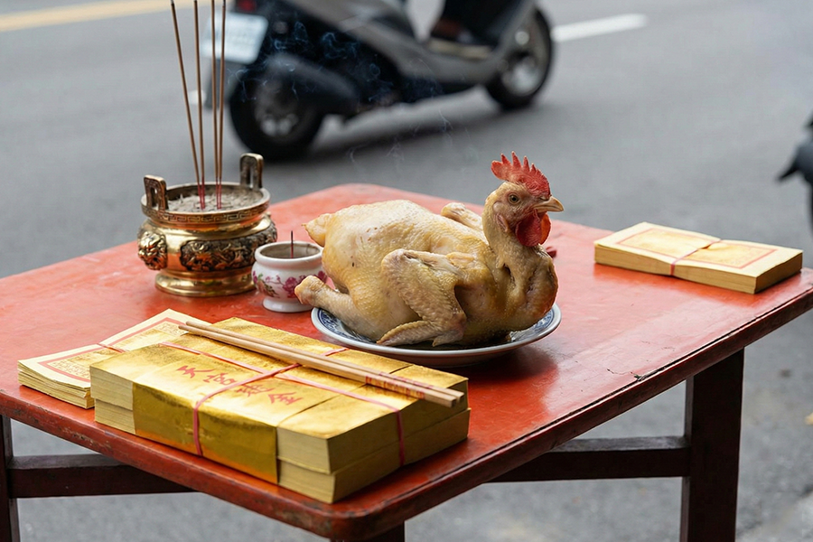 謝沅瑾另提醒,若備有全雞,記得以閩南語「雞」與「家」諧音的意涵,祈求玉帝巡視時照拂「全家」。此外,要用筷子將雞翅膀往後反摺,如同古代犯人雙手反綁,象徵信眾在天公面前承認錯誤、誠心懺悔,雞隻呈現跪姿,也代表對神明的謙卑。