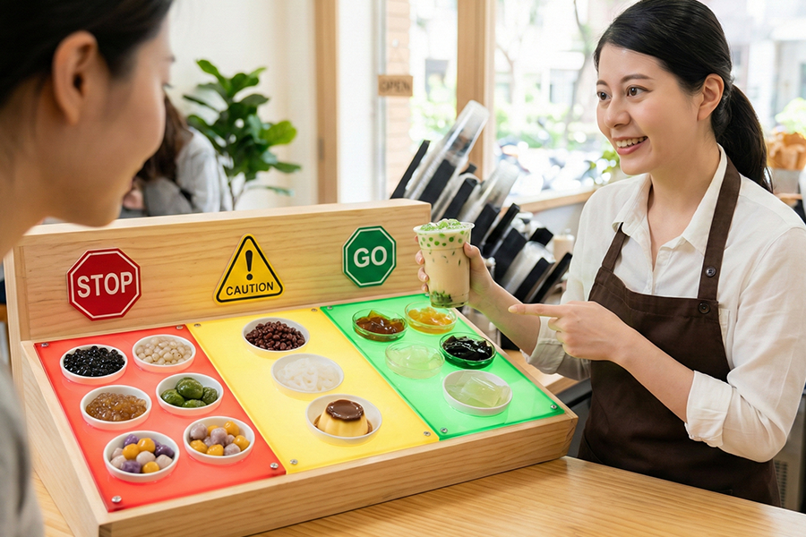 為幫助民眾快速判斷配料熱量,王盈媗營養師設計「咀嚼系手搖飲配料紅綠燈圖卡」,依熱量分級選擇。