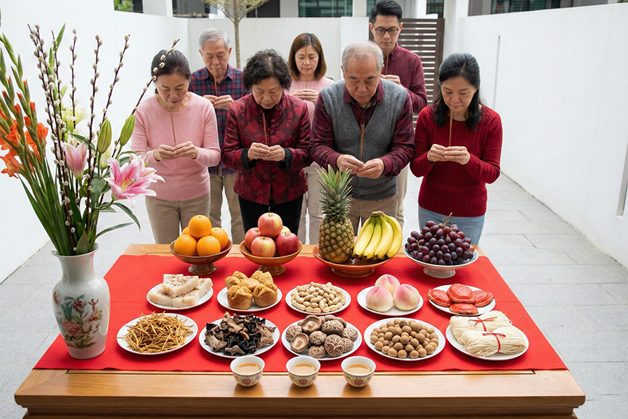 • 水果: 數量可取3、5、6或12樣。選有吉祥寓意的完整新鮮水果。推薦選用橘子(大吉大利)、蘋果(平安)、鳳梨(旺來)、香蕉(招財)、葡萄祈求多子多孫,需整串完整擺放;注意避開芭樂、番茄、釋迦,也不可使用切開或腐壞的水果。