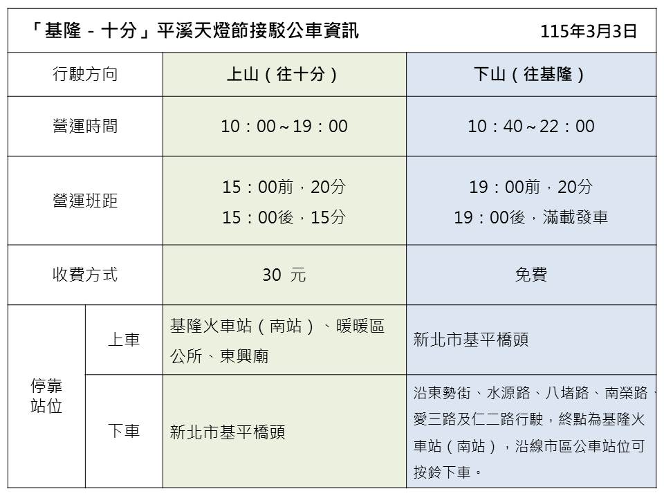 本次接駁公車採取去程收費、回程免費的模式。上山方向(往十分)每人收費30元,營運時間從上午10時至晚間19時;下山方向(往基隆)則提供免費搭乘,營運時間自上午10時40分一路提供服務至深夜22時。