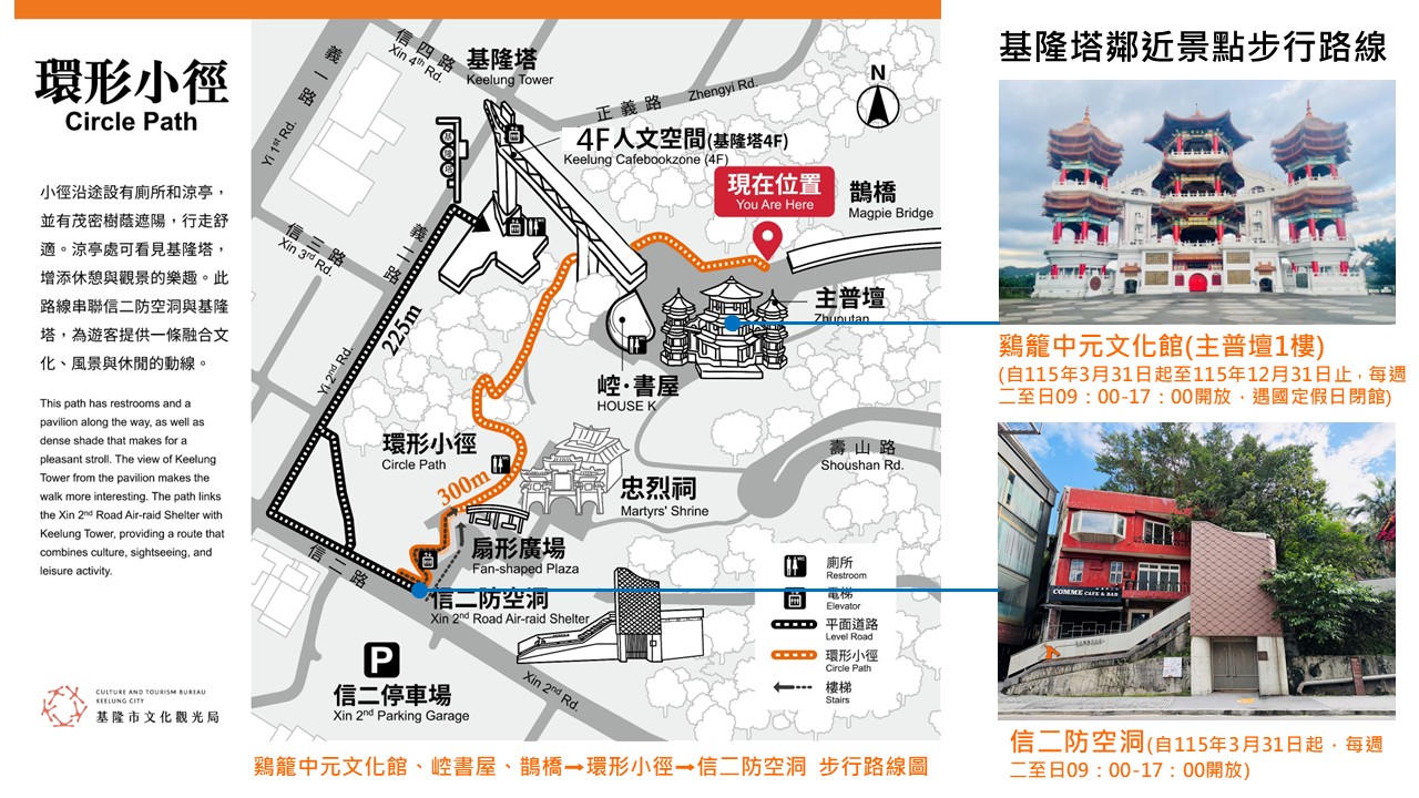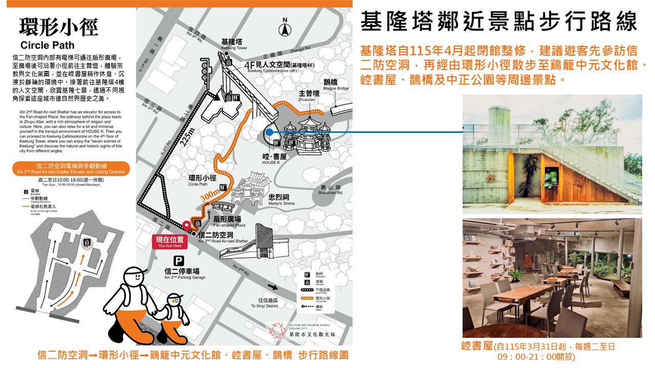 建議可以安排「環形散策」路線:先參訪信二防空洞,再經由小徑前往鷄籠中元文化館、鵲橋及中正公園。這幾個景點均位於基隆塔周邊,且在4月後仍維持正常開放。