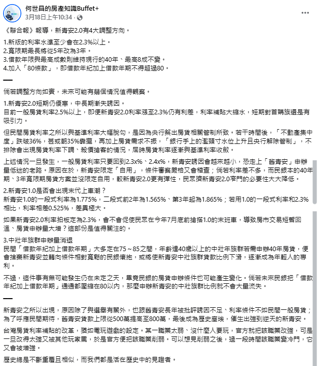 不過他也強調,上述情境是否成真仍在未定之天,畢竟民營銀行的房貸申辦條件同樣可能隨市場變動調整,整體走向仍需持續觀察。何世昌以電玩遊戲比喻台灣的房貸利率補貼政策:某職業太弱就改強,改太強被罵就削弱,削弱後又變冷門再增強,「歷史總是不斷重複且相似」。新青安2.0究竟是務實的政策修正,還是下一輪循環的起點,答案或許要等落日之後才會揭曉。