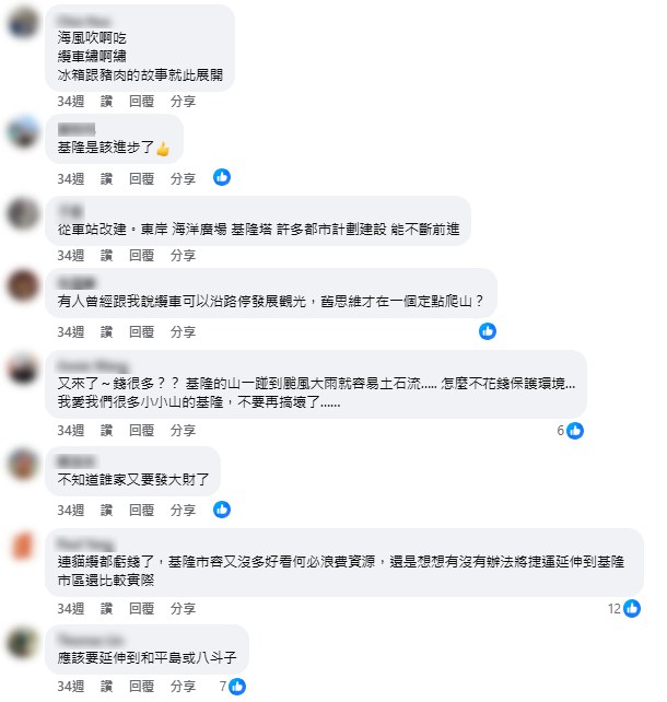路線方面,多位網友建議應延伸至白米甕砲台、東岸碼頭或中正公園方向,串連更多景點才能發揮效益。基隆市觀光協會理事長周建芳也持類似看法,對纜車樂觀其成但直言目前路線太短,效益恐怕有限。