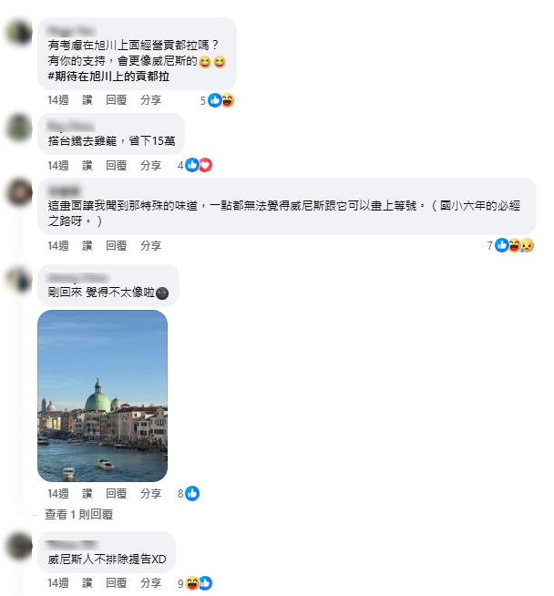 也有曾經住在旭川河旁的網友留言,「這是我家那條河,還真像」、「國小六年的必經之路,這畫面讓我聞到那股特殊的味道」字裡行間是最在地的生活記憶。威尼斯或許遙遠,但對基隆人來說,那條穿過市中心、承載著幾代人記憶的旭川河,才是真正值得被好好對待的風景。