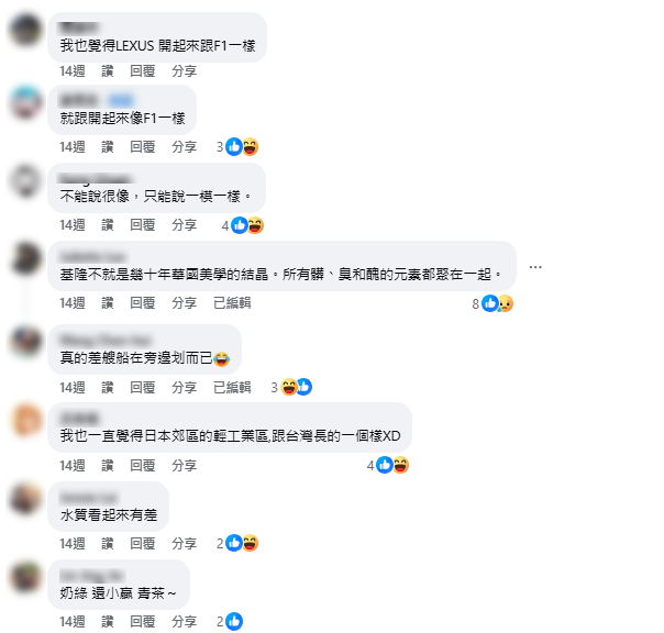 當然,這類對比文最精彩的永遠是留言區的創意發揮。「一定以為你老婆是林志玲,因為一樣都有鼻子有眼睛還有嘴巴」、「我也覺得 LEXUS 開起來跟 F1 一樣」、「八里也跟巴黎差不多」,各種比喻層出不窮。