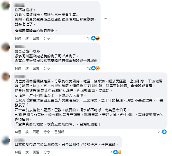 整串討論看下來,表面上是一場「懶覺比雞腿」的歡樂吐槽,底層卻藏著基隆人對自己城市又愛又恨的複雜情感。「基隆真的得天獨厚,有山有水有海,世界上這樣的條件多數都是很美的地方」、「集中做汙水處理,水質改善,房子不要有加蓋違章,旭川也可以很美」、「基隆值得更好」,這些留言的按讚數同樣不低。