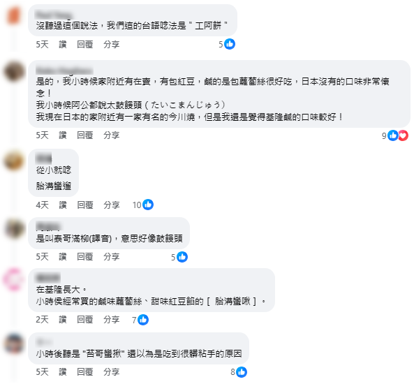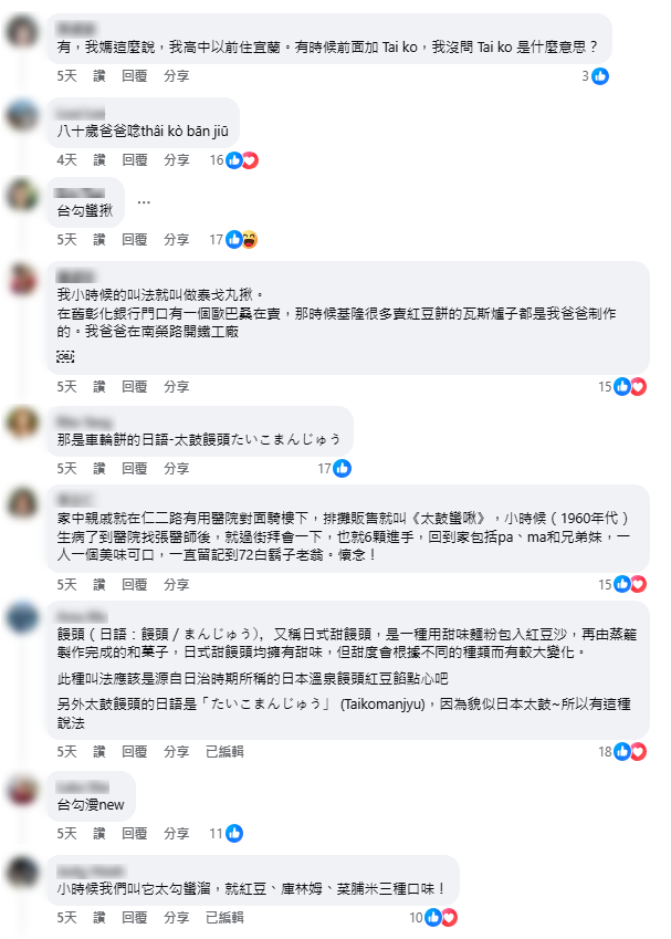 留言中大量網友回覆「有!」,並紛紛拼出自己從長輩那裡聽到的發音:「苔哥蠻啾」、「泰戈蠻揪」、「太勾蠻律」、「太空蠻揪」,拼法五花八門,指向的卻是同一個日語詞彙:太鼓饅頭(たいこまんじゅう,taiko manjū)。這是日本九州一帶對今川燒的傳統稱呼,因為圓鼓鼓的外型神似日本太鼓而得名。